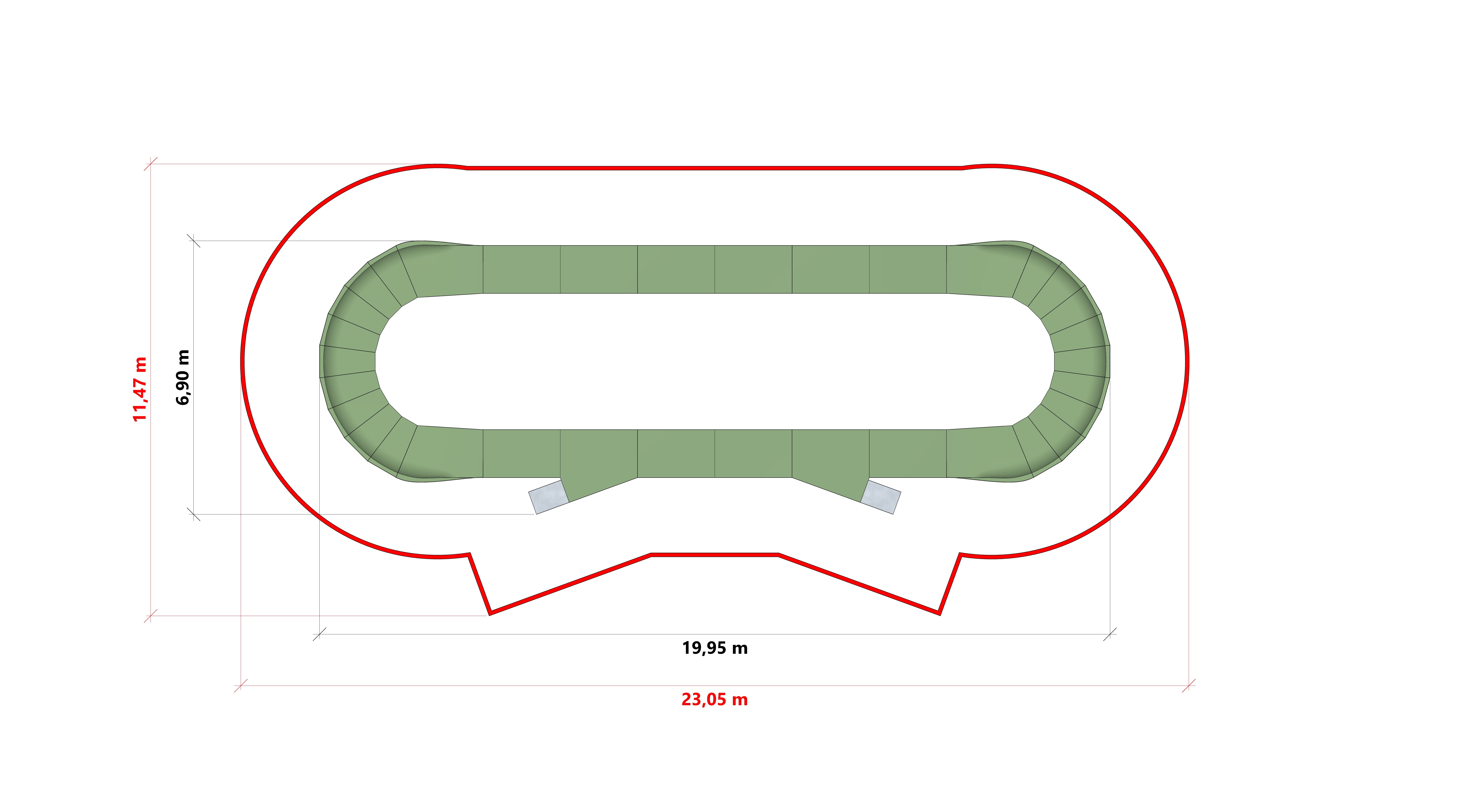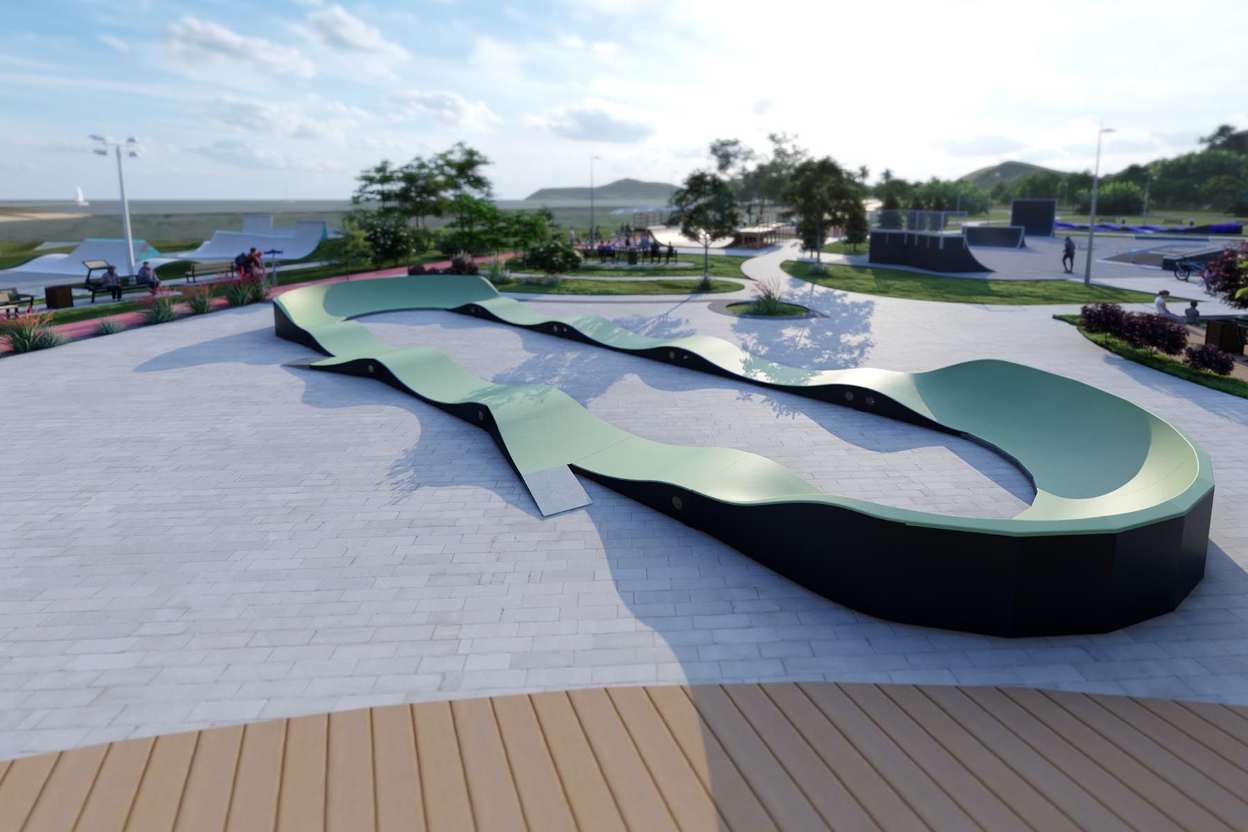 Il Pumptrack CANYON PF2E è un'ampia pista con una lunghezza di 47,8 m, adatta sia ai principianti che agli utenti esperti. Copre un'area di 6,9 m x 19,95 m, offrendo una varietà di sfide e un grande divertimento all'aria aperta. Il suo design accurato la rende una scelta ideale per parchi, scuole e altre aree ricreative.
