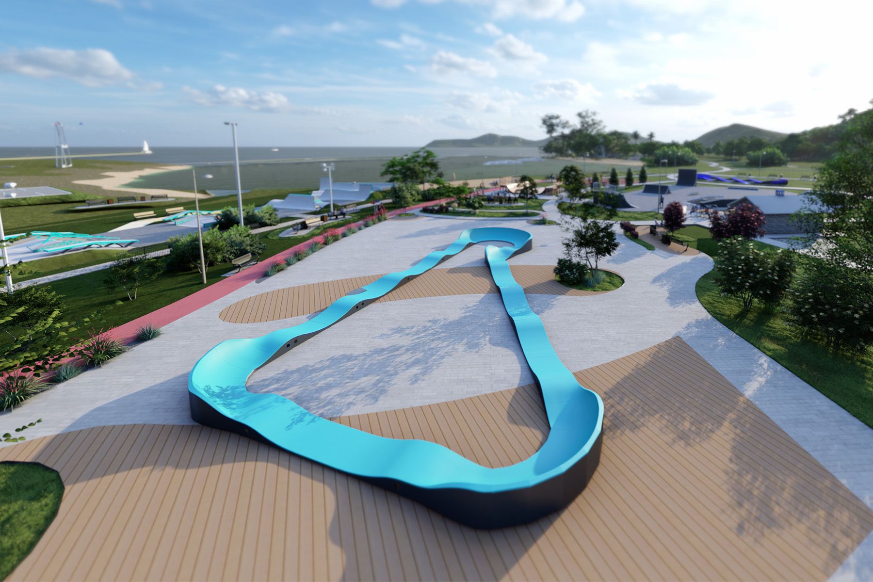 La pista RIVER TF009, lunga 67 metri, è una pista modulare progettata per biciclette, skateboard, pattini in linea e monopattini. Il layout della pista si basa su una sequenza ritmica di gobbe e curve che permettono di mantenere la velocità facendo lavorare il corpo in modo corretto, senza dover pedalare o spingere. Grazie alla sua geometria chiara, la pista è intuitiva da usare e funziona bene sia per i principianti che per gli utenti più esperti.