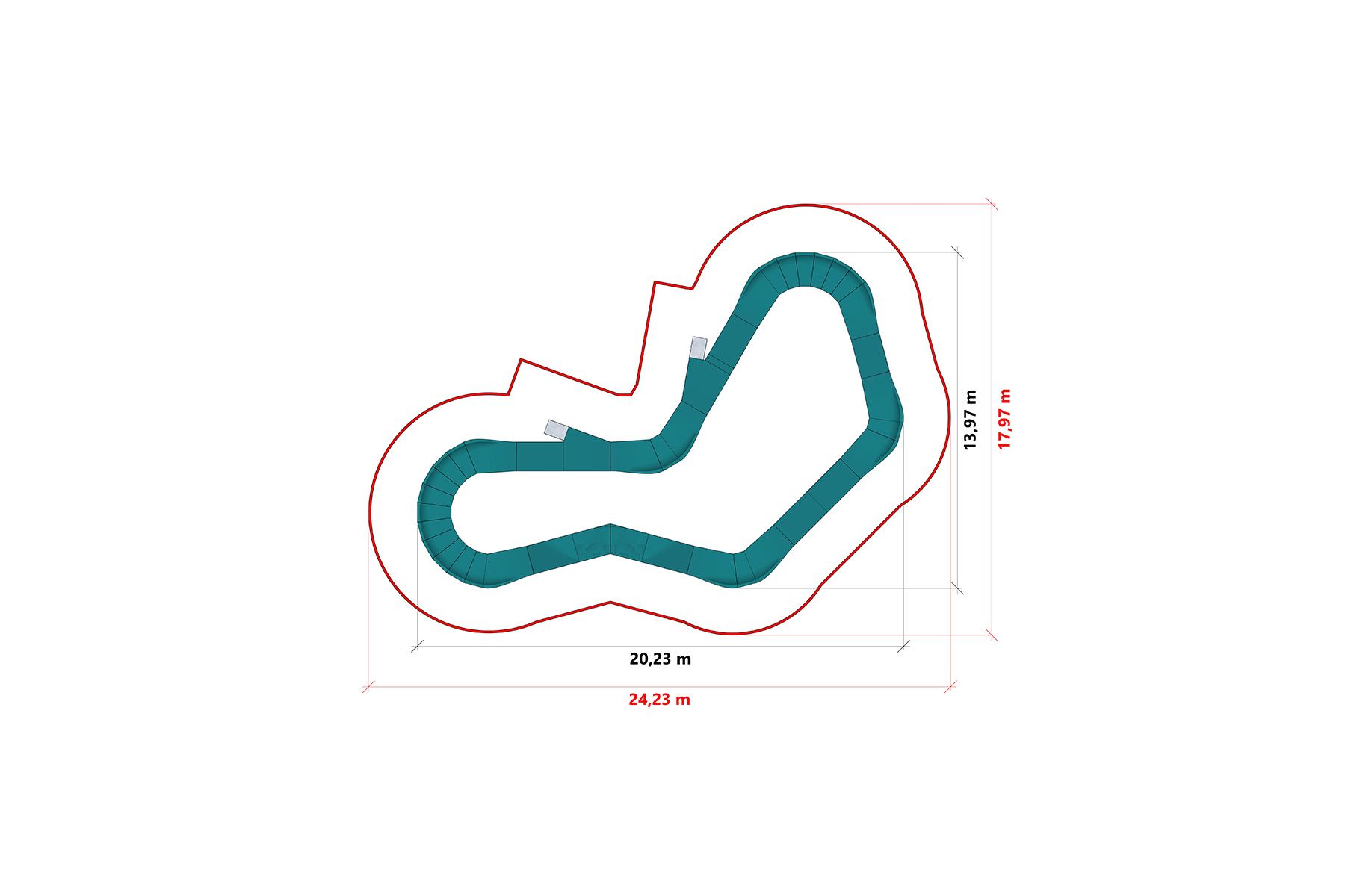 La pista YUKON TF022, lunga 57,6 metri, è una pista modulare progettata per la guida di biciclette, skateboard, rollerblade e monopattini. La geometria della pista offre una guida fluida e intuitiva sia per i principianti che per gli utenti più esperti, rendendo l'impianto adatto come spazio ricreativo per bambini, adolescenti e adulti.